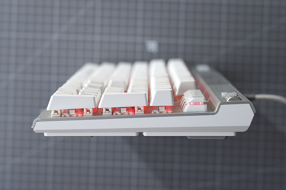 커세어(CORSAIR) K70 RGB PRO OPX의 옆면을 살펴보면 아래쪽으로 내려올수록 각도가 낮아지는 것을 확인할 수 있습니다. 그리고 키캡들은 편안한 타이핑을 위해서 스텝스컬쳐2가 적용되어 있습니다.