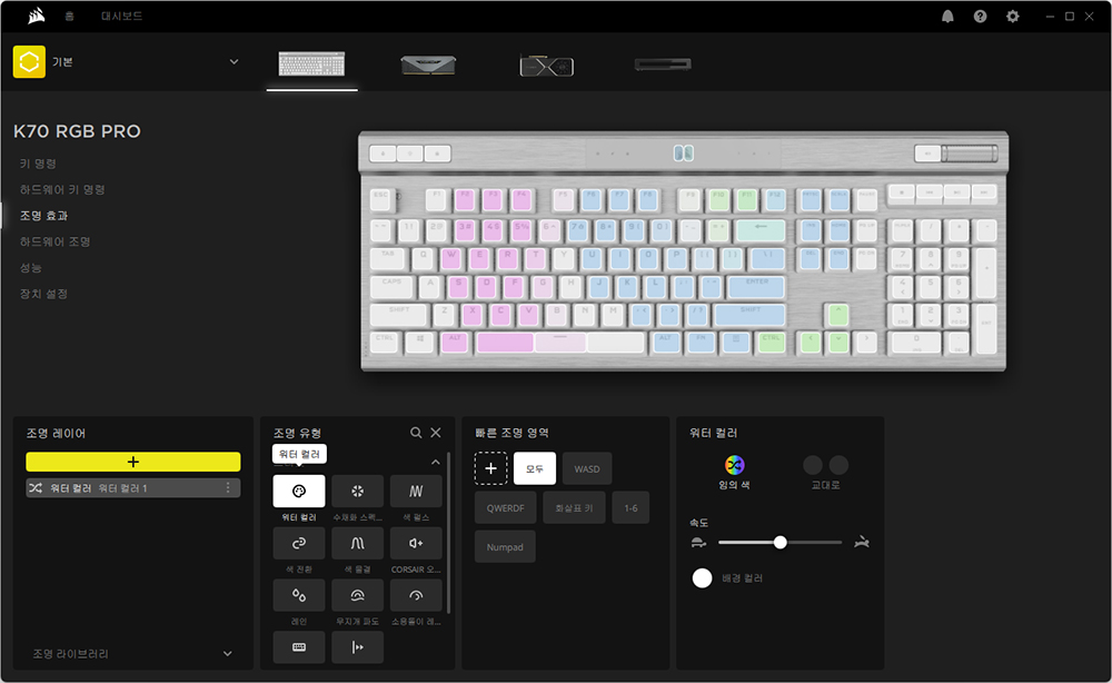조명 효과에서는 다양한 종류의 프리셋들이 준비되어 있고 속도나 방향도 지정할 수 있습니다. 그리고 레이어를 추가해서 자신이 원하는 개별 키에 특정 컬러를 지정할 수도 있습니다.