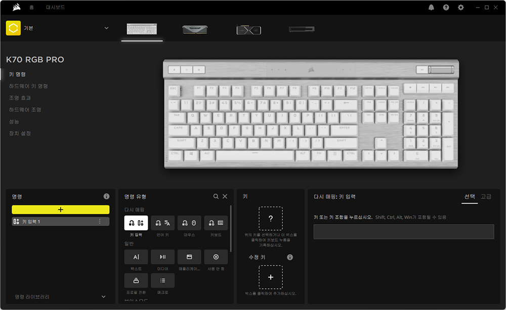 우선 키 명령에서 자신이 원하는 키에 다양한 기능들을 할당해서 사용할 수 있습니다. 특히 게임을 플레이할 때 자주 사용하는 특정 기능들을 매크로로 등록해서 미디어 키에 할당하는 것을 추천합니다.