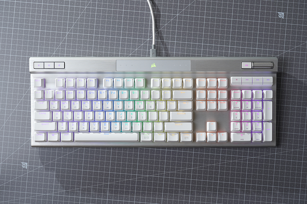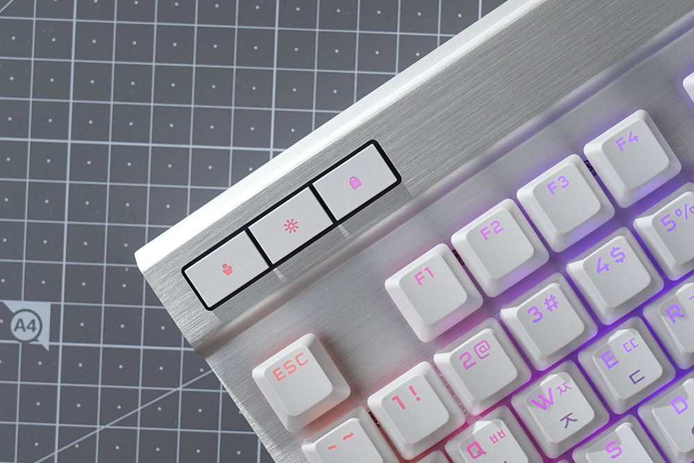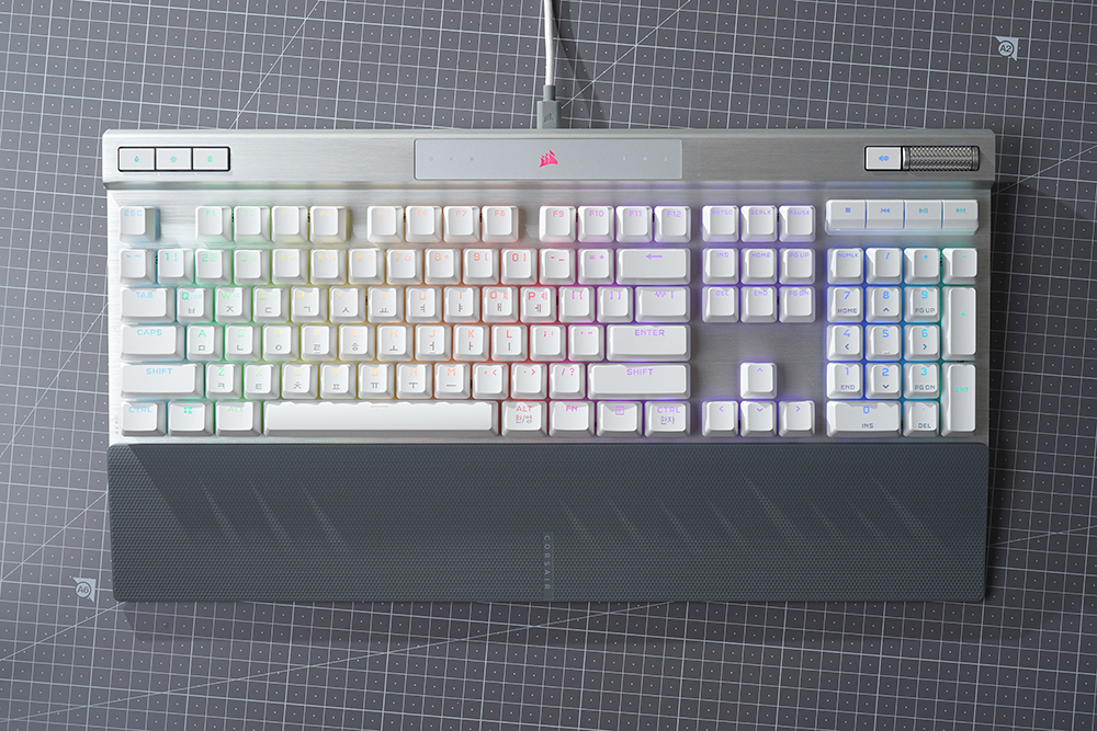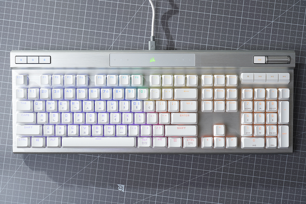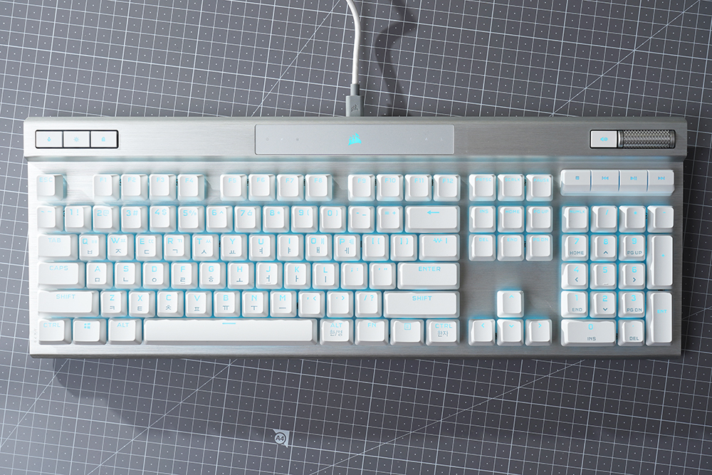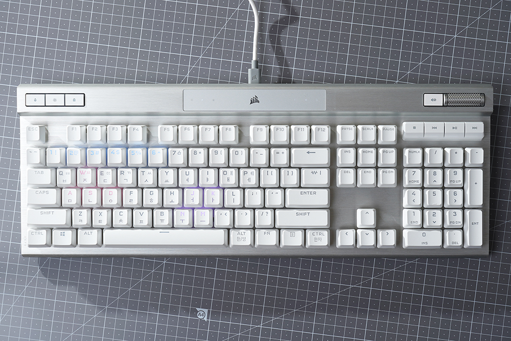 오른쪽에는 볼륨을 조절할 수 있는 CORSAIR 시그니처 알루미늄 룰러와 음소거 버튼 그리고 멀티미디어 키들이 배치되어 있습니다. 게임을 플레이하면서 유튜브를 시청하거나 음악을 듣는 분들에게 유용한 기능들이라고 할 수 있습니다.
