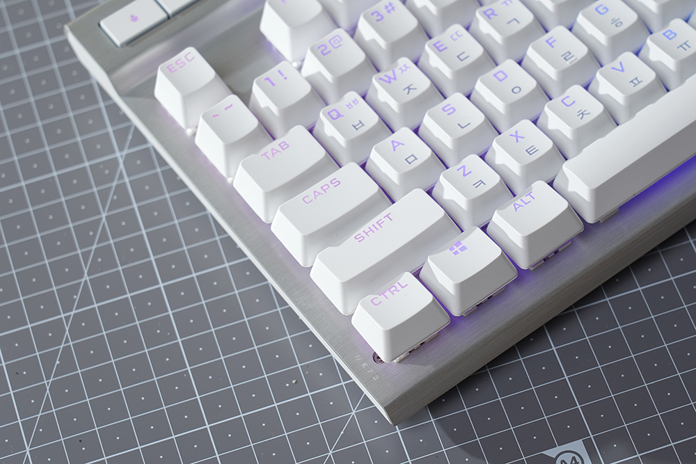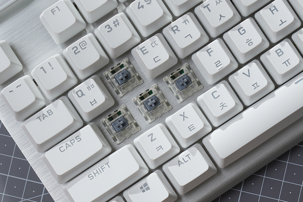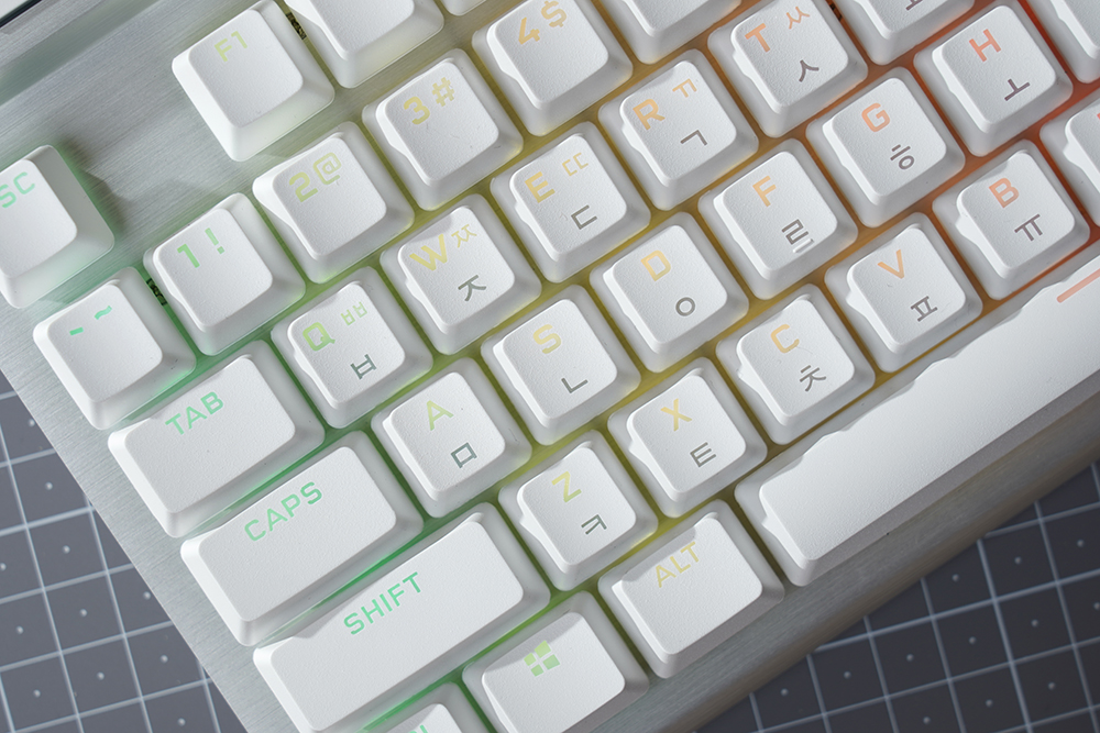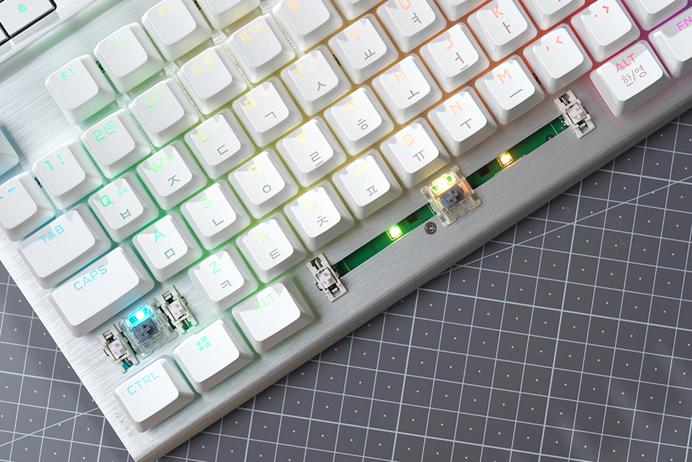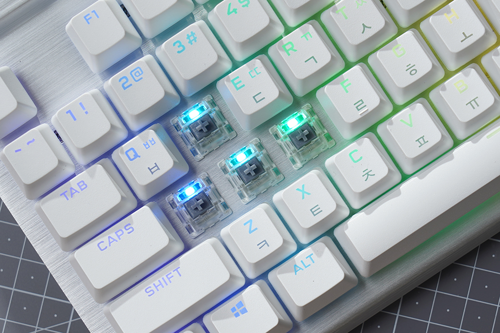 커세어(CORSAIR) K70 RGB PRO OPX에는 1.0mm 작동 거리를 가진 CORSAIR OPX 광학 기계식 키 스위치가 탑재되었습니다. 특히 적외선 방식으로 동작하기 때문에 디바운스 지연이 발생하지 않고 빠른 키 누름 등록이 보장됩니다. 그리고 RGB LED는 위쪽에 배치되어 있어서 한국어 부분의 조명은 조금 약한 편입니다.
