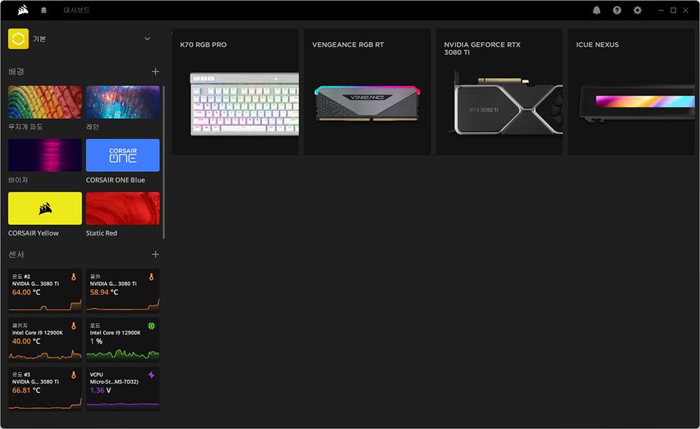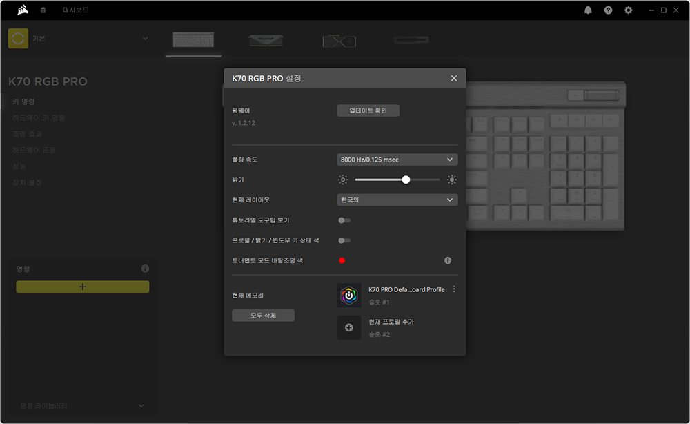 커세어(CORSAIR) K70 RGB PRO OPX는 iCUE라는 소프트웨어를 통해서 관리할 수 있습니다. 특히 키보드와 마우스는 물론이고 커세어(CORSAIR)의 다양한 컴퓨터 주변기기들을 한 번에 관리할 수 있다는 점이 편리한 부분입니다.