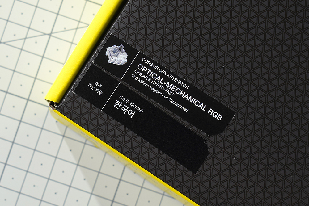 커세어(CORSAIR) K70 RGB PRO OPX의 박스는 블랙과 커세어를 상징하는 노란색으로 제작되었는데요. 세련된 느낌을 주는 편입니다. 특히 삼각형 형태의 패턴들이 표면에 인쇄되어 있다는 점이 디자인의 완성도를 높여주는 요소라고 생각되었습니다.