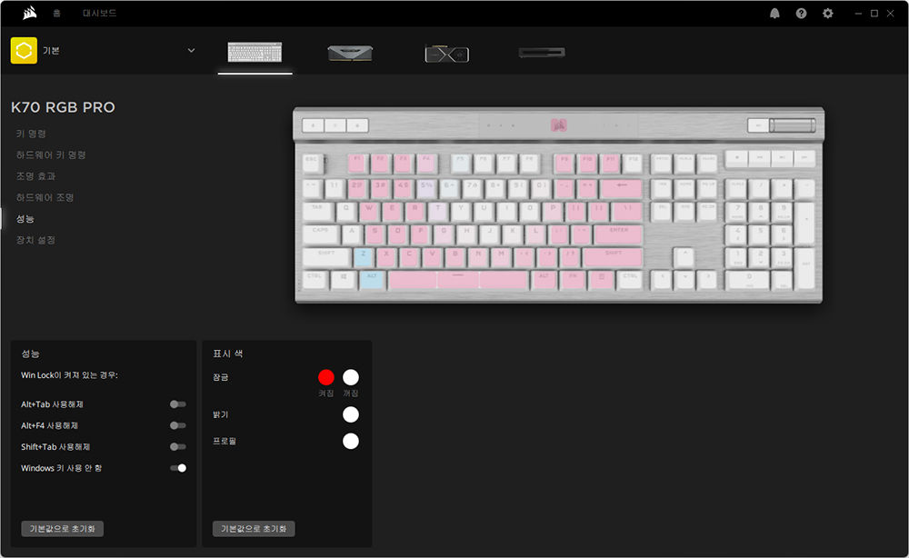 왼쪽 위를 살펴보면 프로필 전환과 백라이트 밝기 그리고 Windows 키 잠금 핫키가 배치되어 있습니다. 전용 소프트웨어를 사용하지 않고도 해당 기능들을 빠르게 사용할 수 있다는 장점이 있습니다.