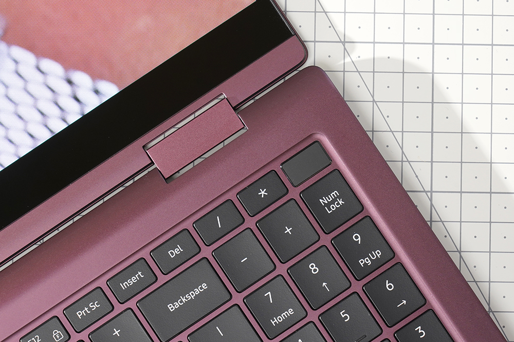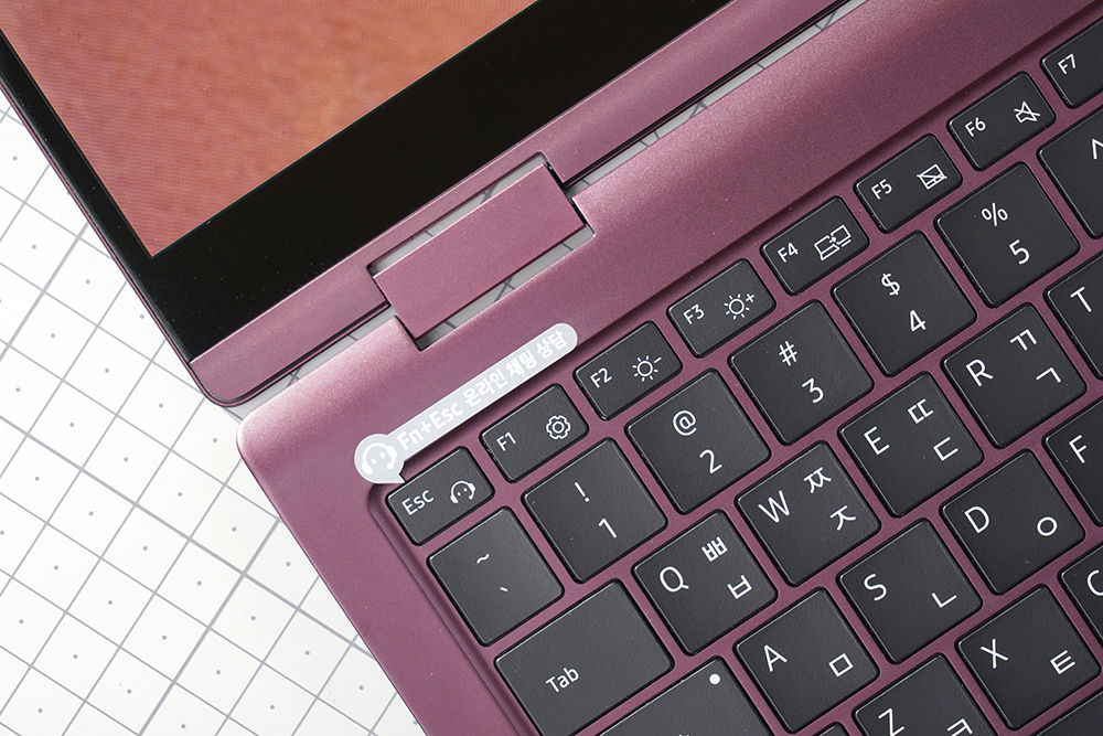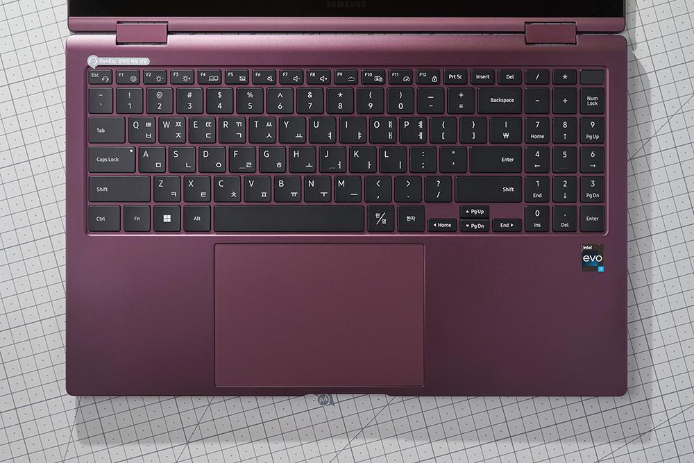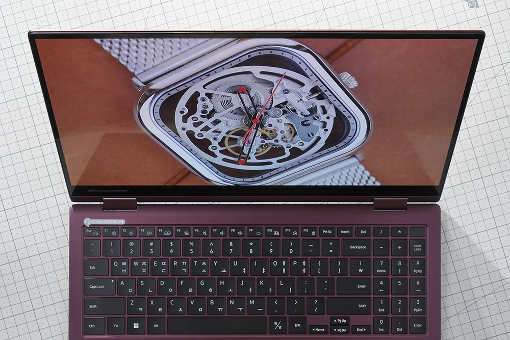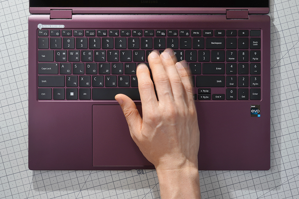 삼성전자 갤럭시북2 프로360 키보드의 키캡 높이는 낮은 편이고 키감은 깔끔한 느낌을 주는 편입니다. 그리고 숫자키를 포함하고 있어서 문서 작업 용도로도 활용할 수 있습니다.