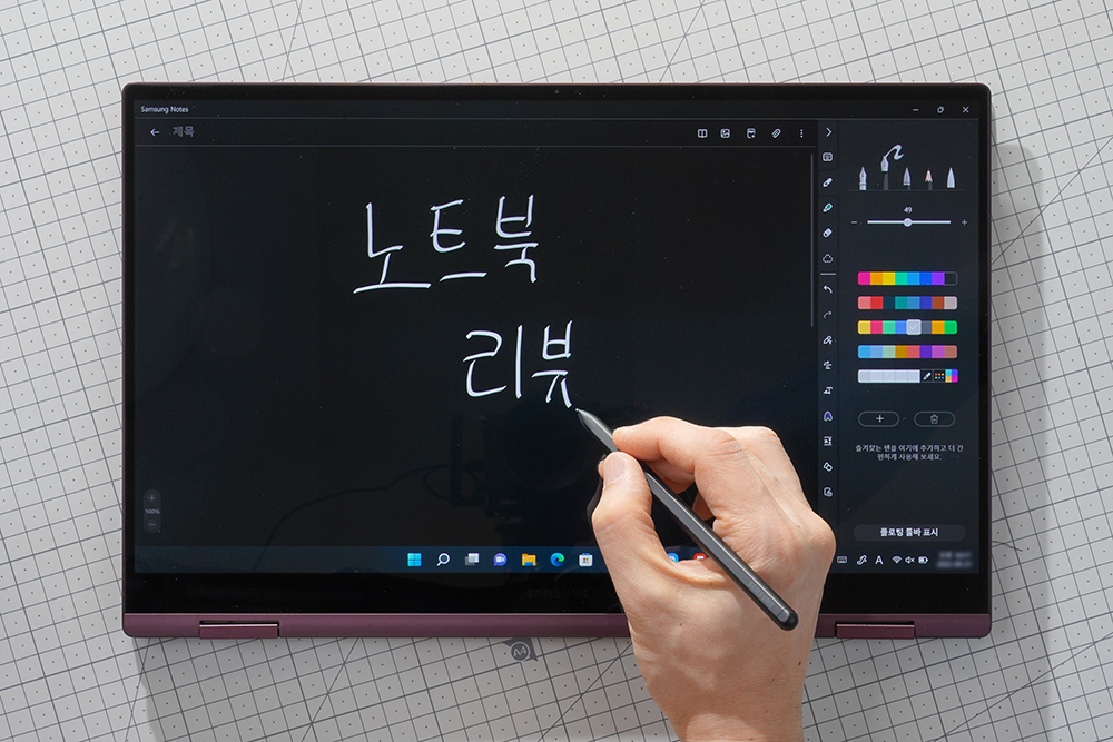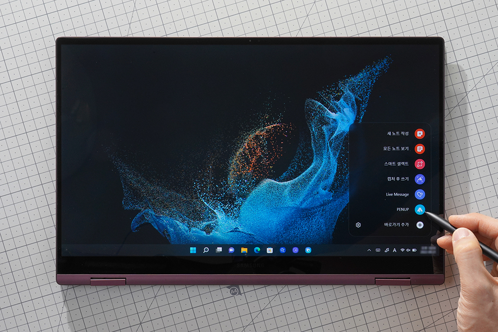 삼성전자 갤럭시북2 프로360의 핵심 기능 중의 하나는 S펜을 이용해서 정밀하게 그림을 그리거나 필기를 할 수 있다는 점입니다. 특히 갤럭시 탭 시리즈와 같은 에어 커맨드와 같은 기능을 지원한다는 점이 편리한 부분입니다.