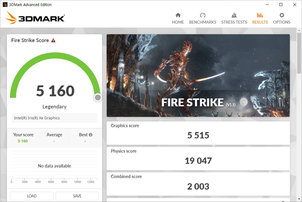 3D마크를 이용해서 성능을 확인해 보면 파이어 스트라이크(Fire Stike)는 5160점(그래픽 스코어 5515점) 타임 스파이(Time Spy)는 1950점(그래픽 스코어 1727점)으로 측정되었습니다.