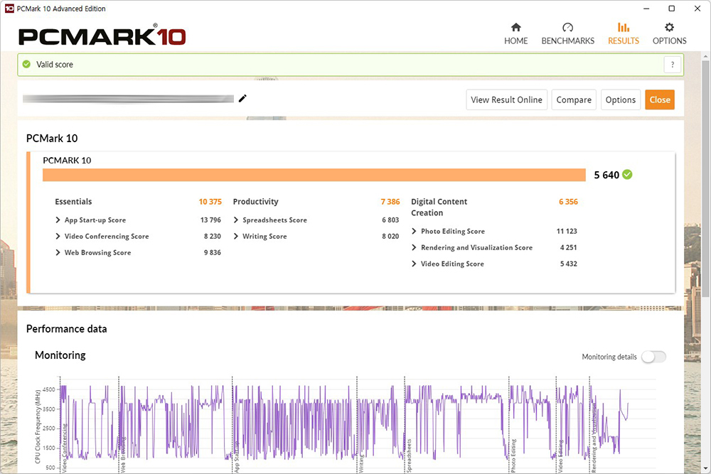 마지막으로 노트북의 전반적인 성능을 평가해주는 PCMARK10의 점수는 5640점으로 측정되었습니다. 뛰어난 성능을 제공해주기 때문에 매일 최고의 프리미엄 노트북을 경험할 수 있습니다.