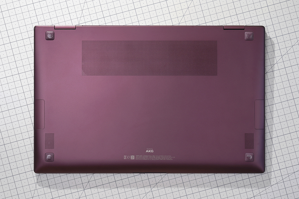 바닥을 살펴보면 모서리 부분에 고무 지지대가 배치되어 있어서 책상 위에서 잘 미끄러지지 않도록 디자인되었습니다. 그리고 아래쪽의 좌우에는 AKG 스테레오 스피커(Max 5Wx2) 스피커가 배치되어 있습니다.