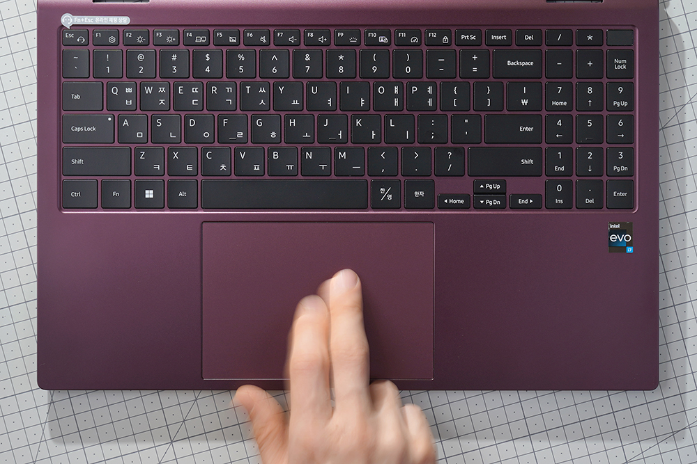 큼지막한 크기의 터치패드는 멀티 터치를 지원해서 웹 페이지를 스크롤 하는 등의 용도로도 활용할 수 있습니다. 참고로 삼성전자 갤럭시북2 프로360은 터치스크린을 지원하기 때문에 자신이 편리한 방식을 노트북을 사용할 수 있습니다.