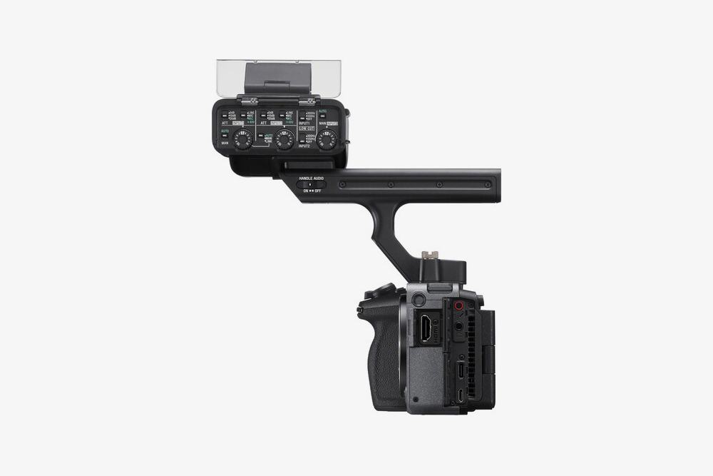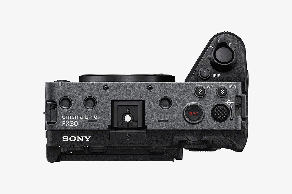 소니 FX30 콤팩트 시네마 카메라의 상단을 살펴보면 심플하게 디자인되었습니다. 그리고 XLR 핸들 유닛이나 외장 모니터 그리고 마이크 등 다양한 종류의 장치들을 연결해서 사용할 수 있도록 설계되었습니다.