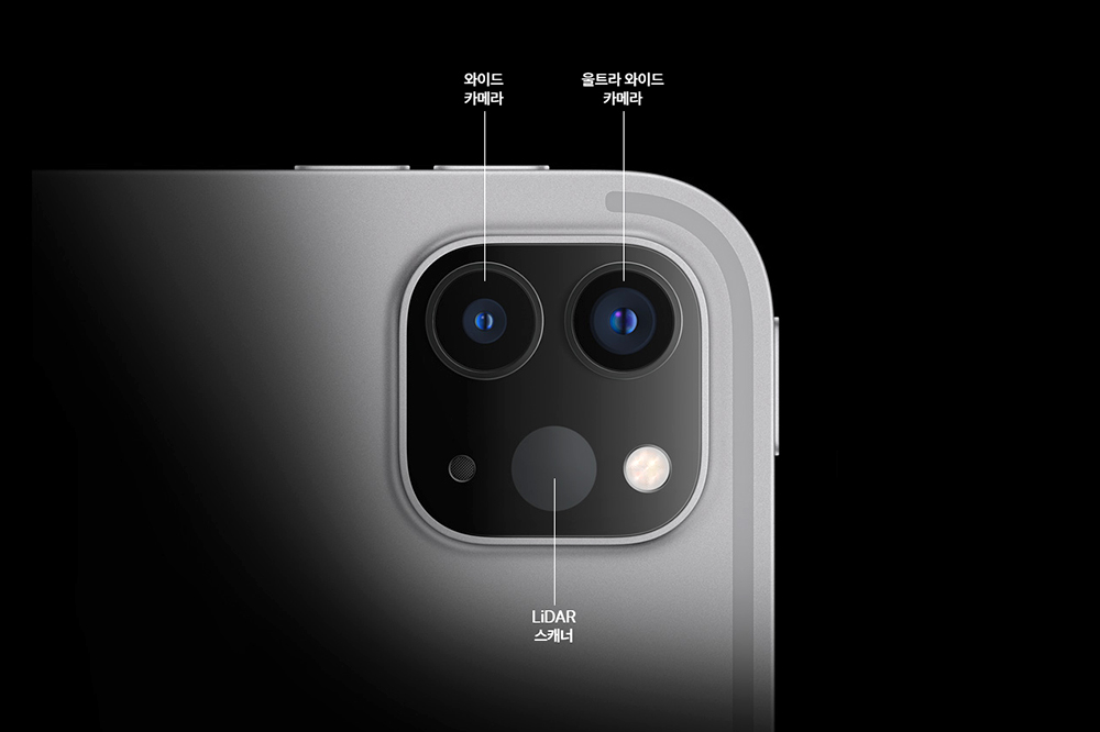 아이패드 프로 6세대에는 1200만 화소의 광각과 1000만 화소의 초광각 듀얼 카메라가 탑재되었습니다. 특히 LiDAR 스캐터를 통해서 심도 맵을 작성할 수 있다는 특징이 있고 AR용도로도 활용할 수 있습니다. 참고로 최대 4K 30 프레임 ProRes 동영상 촬영도 가능하다고 합니다.