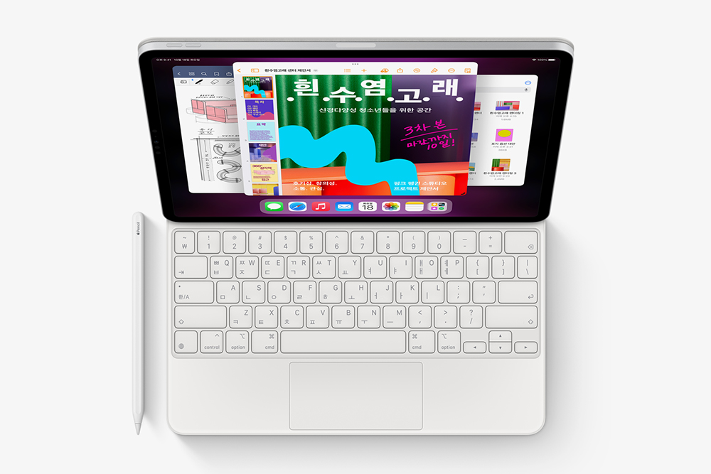 우선 매직 키보드를 이용하면 아이패드 프로 6세대를 흡사 노트북과 유사한 형태로 활용할 수 있도록 도와주는 역할을 합니다. 다양한 장소에서 조금은 전문적인 작업을 해야 하는 분들에게 유용한 제품이라고 할 수 있습니다.