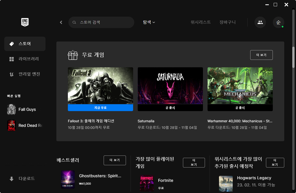 에픽게임즈 런처의 중간을 살펴보면 Fallout 3: 올해의 게임 에디션이 10월 28일까지 무료로 제공된다는 내용이 설명되어 있습니다. 그리고 다음 주에 공개될 무료 게임도 오픈되어 있습니다.