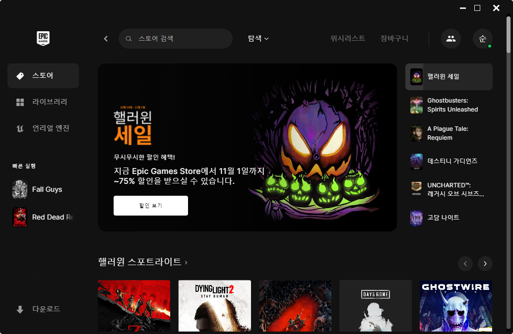 가장 먼저 에픽게임즈 런처를 다운로드 받아서 설치해야 합니다. 참고로 단순히 라이브러리에만 추가할 목적이라면 아래쪽 링크를 이용해서 간단하게 추가할 수 있습니다. 그리고 현재 핼러윈 세일을 진행하고 있습니다. 11월 1일까지 최대 75% 정도의 할인이 제공되기 때문에 관심이 있는 분들이라면 이번 기회를 놓치지 않는 것이 좋을 것 같습니다.