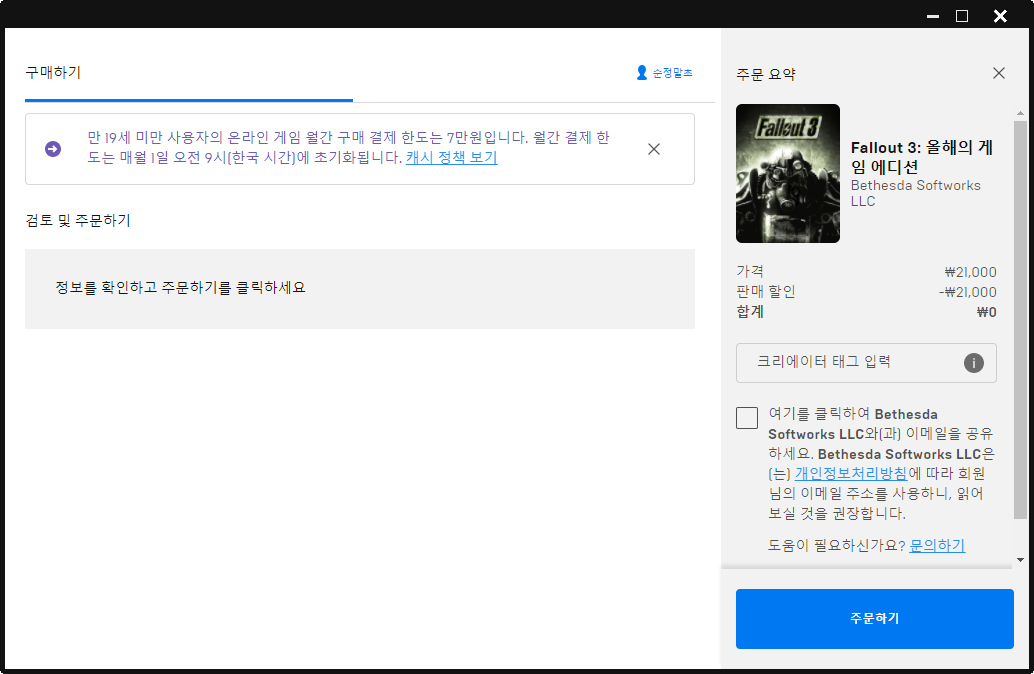 받기를 선택하면 주문하기 메뉴로 이동합니다. 그리고 주문하기 위쪽에 배치된 체크 표시를 선택하면 이메일 정보를 베데스다 소프트웍스와 공유하게 되는데요. 저는 체크를 하지 않는 것을 추천합니다.