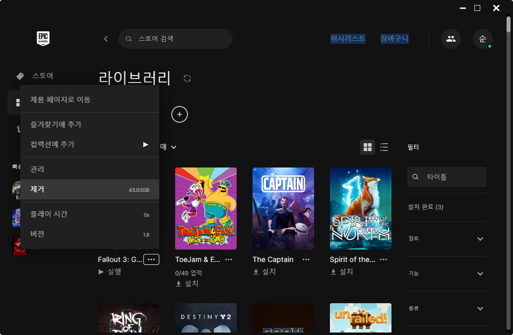 이제 자신의 라이브러리에 추가된 폴아웃3 GOTY 에디션를 설치해 보면 우선 설치 위치 폴더를 선택해주면 다운로드가 진행됩니다. 약 30기가 이상 다운로드를 하고 완전히 설치되면 43.03GB의 용량을 차지하게 됩니다.
