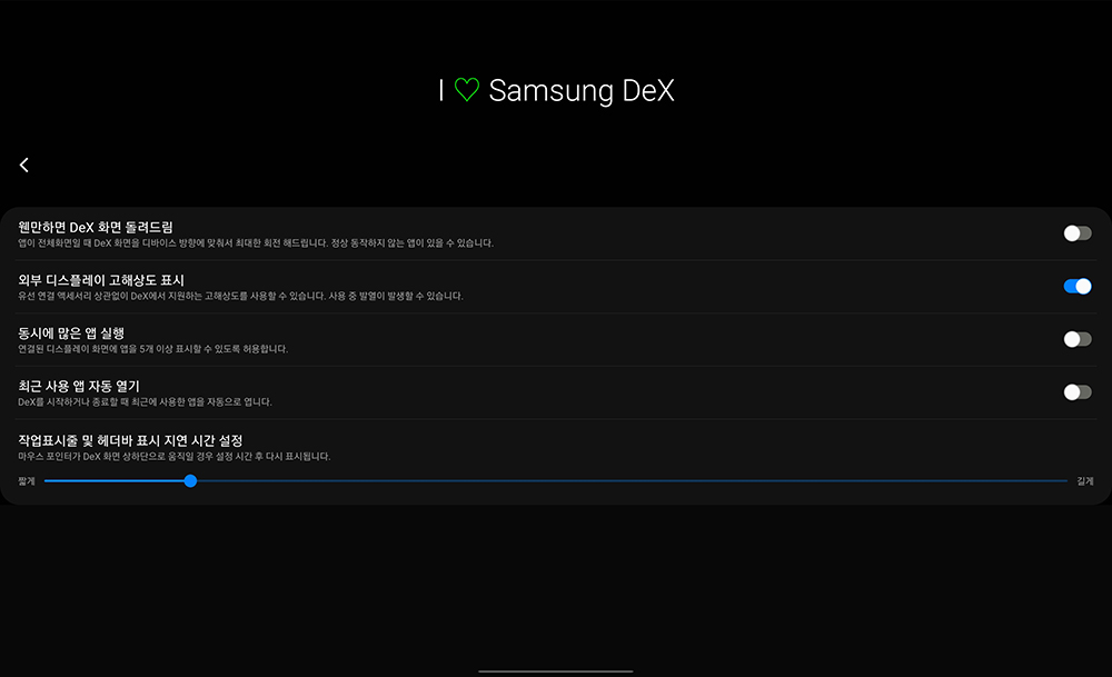 멀티스타의 I ♡ Samsung DeX라는 메뉴를 확인해 보면 두 번째에 외부 디스플레이 고해상도 표시라는 메뉴가 준비되어 있습니다. 유선 연결 액세서리에 상관없이 Dex에서 지원하는 고해상도를 사용할 수 있게 만들어주는 옵션이지만 발열이 증가할 수 있습니다.
