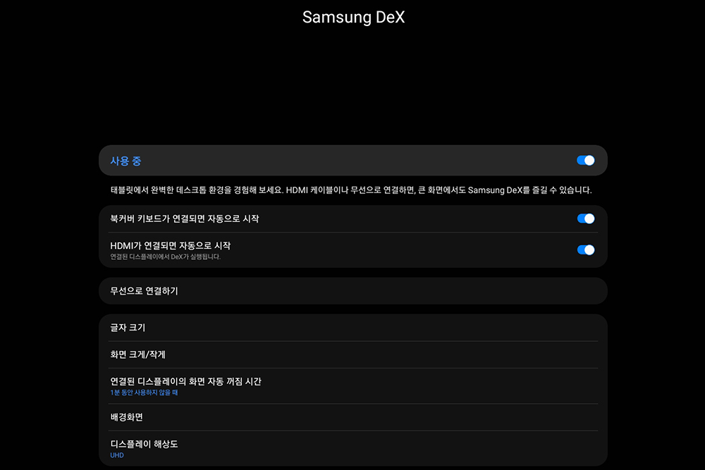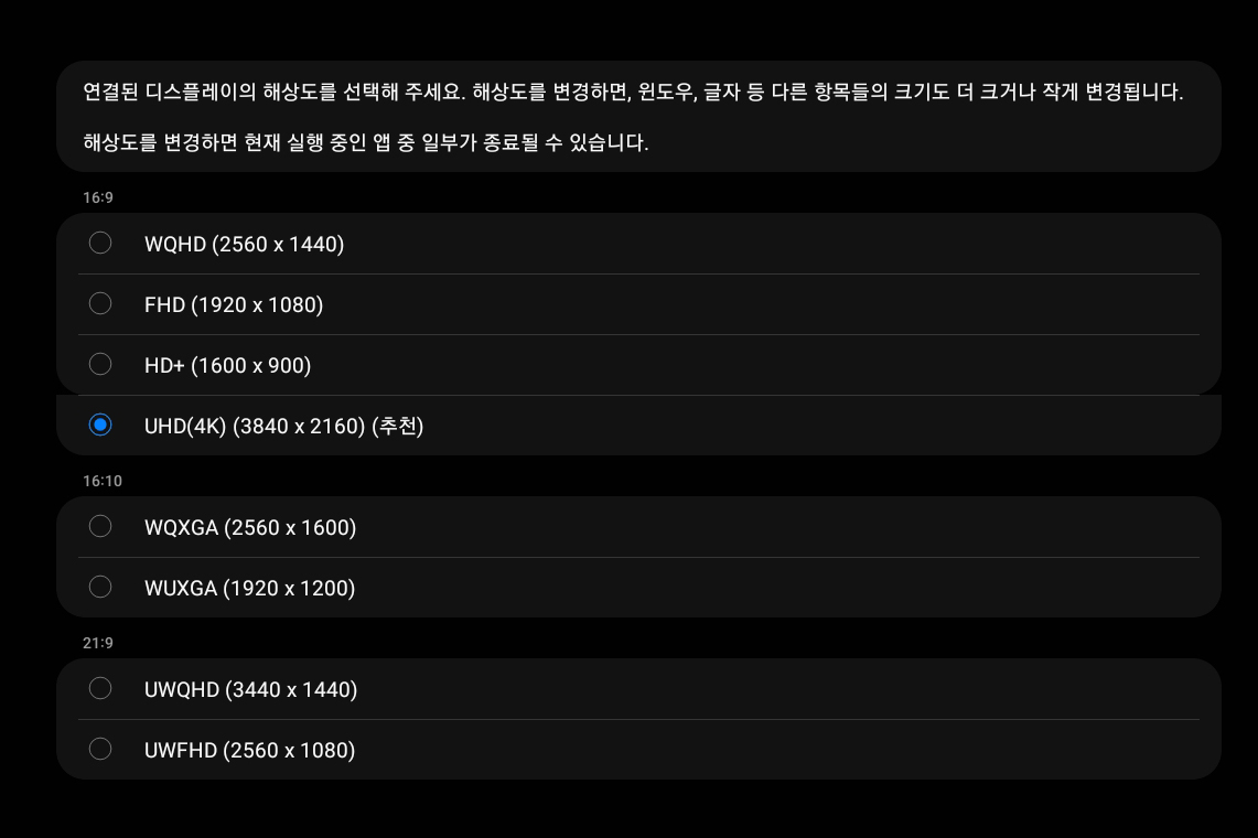 그리고 삼성 DeX의 설정을 확인해보면 디스플레이 해상도에서 UHD(4K) (3840 x 2160) (추천)이라는 메뉴가 활성된 것을 확인할 수 있습니다. 만약 멀티스타에서 외부 디스플레이 고해상도 표시라는 메뉴를 활성화하지 않으면 WQHD(2560 x 1440)만 표시됩니다.