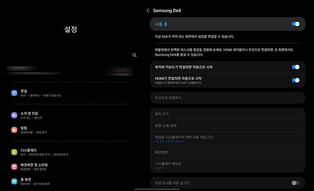 그리고 삼성 DeX를 자주 사용하는 분들에게 제가 추천하는 메뉴는 HDMI가 연결되면 자동으로 시작입니다. 해당 기능을 설정하면 번거로운 절차 없이 케이블을 연결해서 바로 삼성 DeX 기능을 실행시킬 수 있습니다.