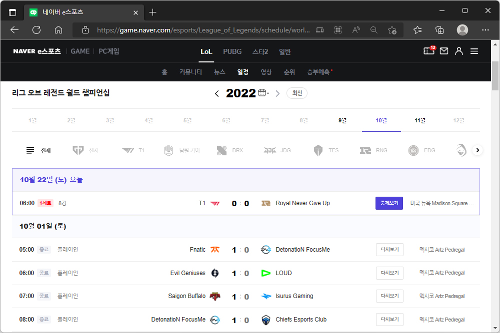 일정 메뉴를 확인해 보면 10월 01일에 진행된 플레이인부터 타이브레이커, 플레이인 녹아웃, 그룹스테이지, 8강, 4강, 결승전까지 모든 경기들을 내용을 확인해 볼 수 있고 바로 다시보기를 할 수 있습니다.