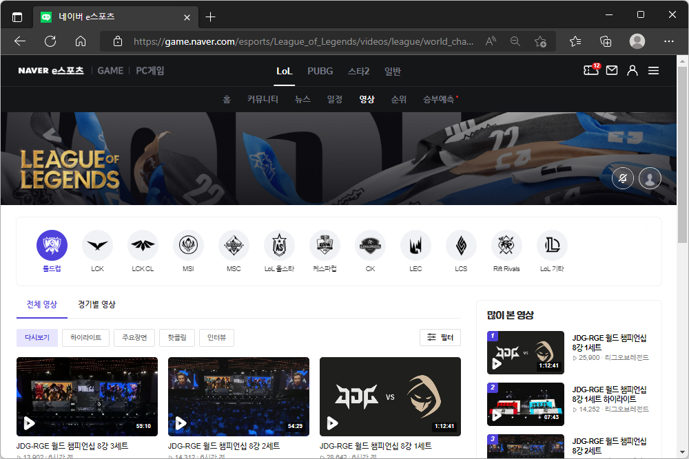 영상 메뉴에서는 다시보기와 하이라이트 그리고 주요장면과 핫클립, 인터뷰로 구성되어 있습니다. 그 외에도 롤드컵은 물론이고 LCDK와 LCK CL, MSI, MSC, Lol 올스타, 케스파컵, CK, LEC, LCS까지 다양한 경기를 다시 시청할 수 있습니다.