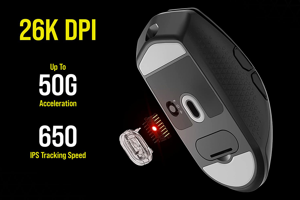커세어 카타르 엘리트 무선 게이밍 마우스에는 CORSAIR MARKSMAN 광삭 센서가 탑재되었습니다. 26,000DPI와 650IPS 추적 속도 그리고 50G 가속을 지원합니다.