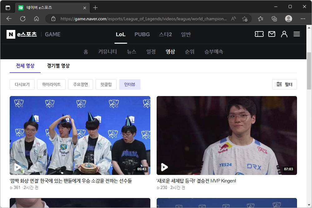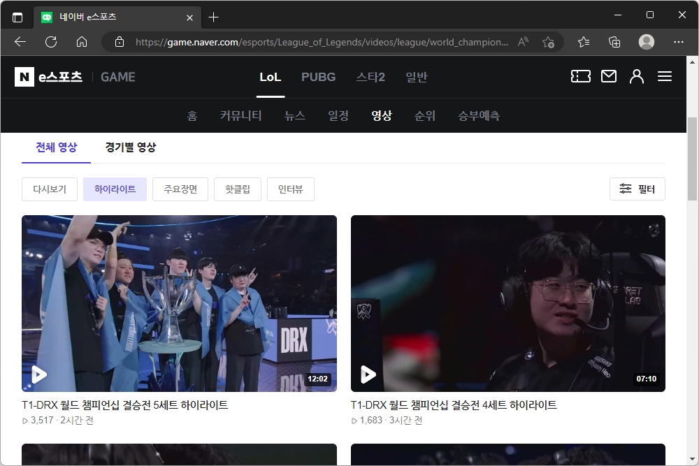 우선 위에 있는 네이버 e스포츠 LoL 메인페이지에 접속하면 위쪽에 홈과 커뮤니티, 뉴스, 일정, 영상, 순위, 승부예측과 같은 메뉴들이 준비되어 있고 영상에서 기존에 진행되었던 영상들을 시청할 수 있습니다.