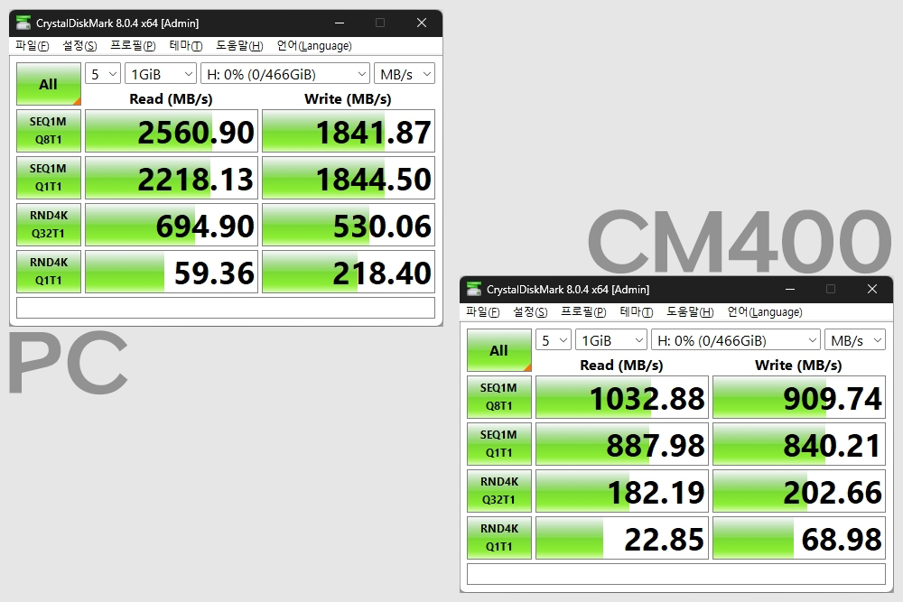 유그린 CM400 M.2 NVMe SSD 외장케이스의 속도를 확인해 보면 왼쪽은 데스크톱PC에 직접 연결했을 때이고 오른쪽은 외장케이스에 장착했을 때입니다. 읽기는 1032MB/s, 쓰기는 909MB/s 정도가 측정되었는데요. 준수한 수준이라고 판단되었습니다.