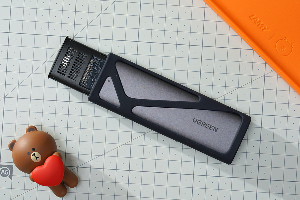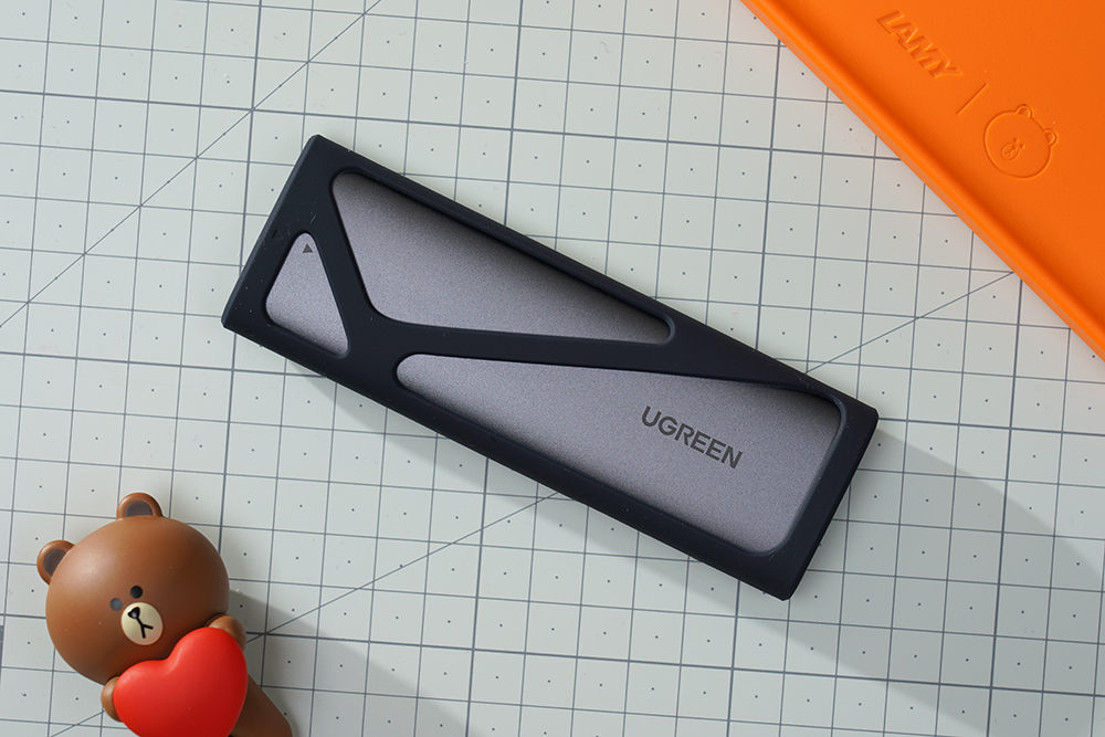 유그린 CM400 M.2 NVMe SSD 외장케이스는 알루미늄 합금으로 제작되었고 실리콘 케이스가 기본으로 장착되어 있어서 바닥에 떨어트려도 각도에 따라서 다르겠지만 상처가 생길 확률을 줄일 수 있습니다.