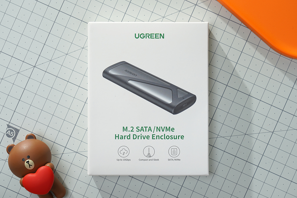 유그린 CM400 M.2 NVMe SSD 외장케이스의 박스는 콤팩트한 크기로 제작되었고 아래쪽에는 주요 특징이 설명되어 있습니다. 핵심은 10Gbps의 속도를 지원한다는 점입니다.