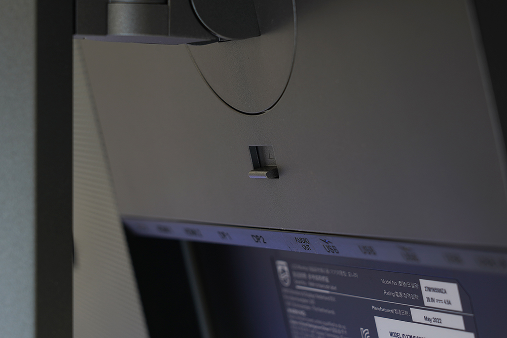 반대쪽 옆면에는 도난 방지를 위한 켄싱턴 락이 준비되어 있습니다. 참고로 필립스 27M1N5500ZA 게이밍 모니터에는 5W x2출력의 스피커가 배치되어 있어서 비용과 공간을 절약할 수 있습니다.