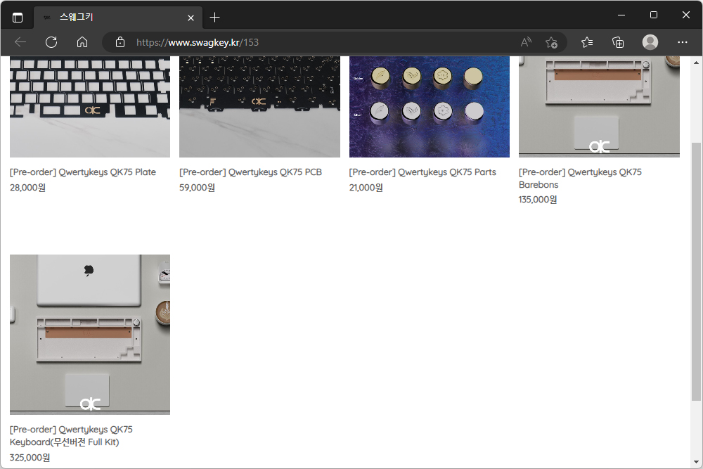 Qwertykeys QK75의 가격은 합리적인 편입니다. 우선 베어본의 경우에는 135,000원이고 무선 기판은 73,000원 그리고 보강판은 28,000원입니다. 그리고 키캡과 스위치까지 포함된 FULL KIT의 경우에는 325,000원으로 책정되었습니다.