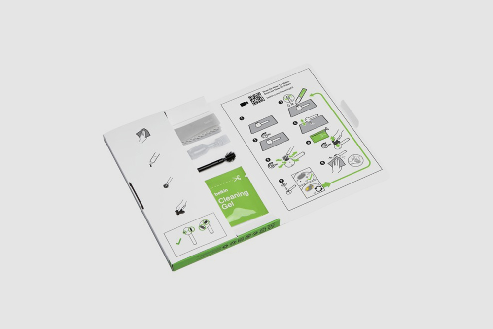 벨킨 에어팟 청소 키트의 구성품을 살펴보면 극세사천(Microfiber cloth)과 왁스 연화제(Wax softener) 그리고 청소용 솔(Cleaning brush)과 청소 젤(Cleaning gel)로 구성되어 있습니다. 그리고 패키지에 사용 방법이 설명되어 있습니다.