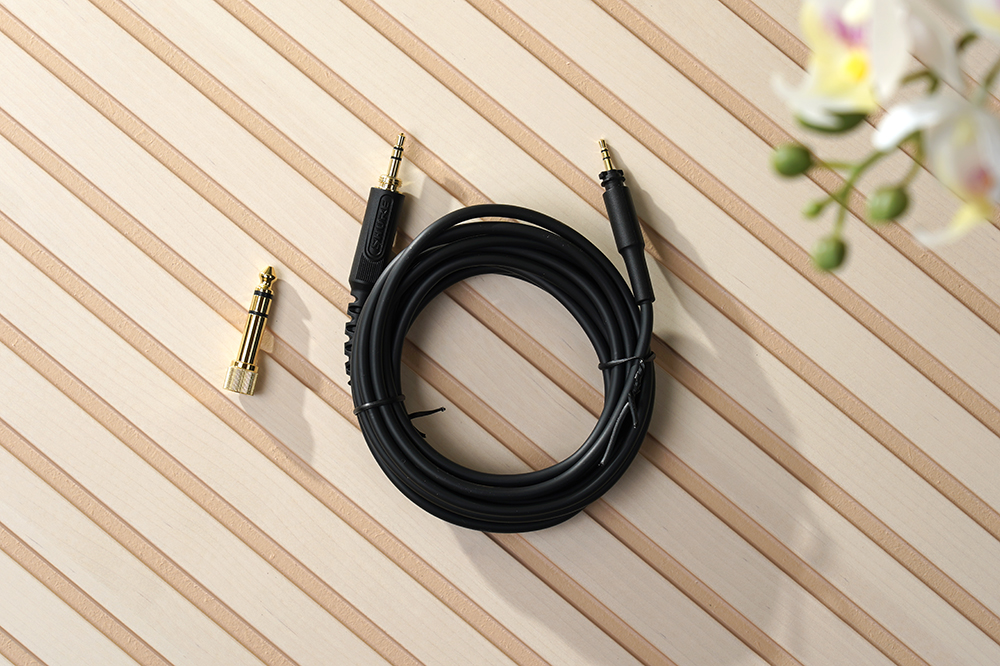 그리고 3m 길이의 직선형 케이블도 기본으로 제공됩니다. 편리한 부분은 착탈식으로 디자인되어서 간단하게 교체할 수 있다는 점입니다. 참고로 코일형 케이블도 별도로 구매할 수 있다고 합니다. 그리고 6.3mm 금도금 어댑터고 액세서리에 포함되어 있습니다.