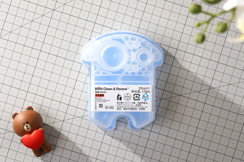 그리고 브라운 5430 세척&충전 스테이션의 경우에는 90% 이상의 알코올 성분으로 제작된 세정액을 넣어서 사용해야 합니다. 레몬 오일이 첨가되어 있어서 상쾌한 느낌을 주는 편이고 BRAUN에서는 최대 30회를 사용할 수 있고 8주마다 한 번씩 교체하는 것을 권장하고 있습니다. 은근히 유지비가 많이 나가서 자체적으로 알코올을 구매해서 세척하는 경우도 있습니다.