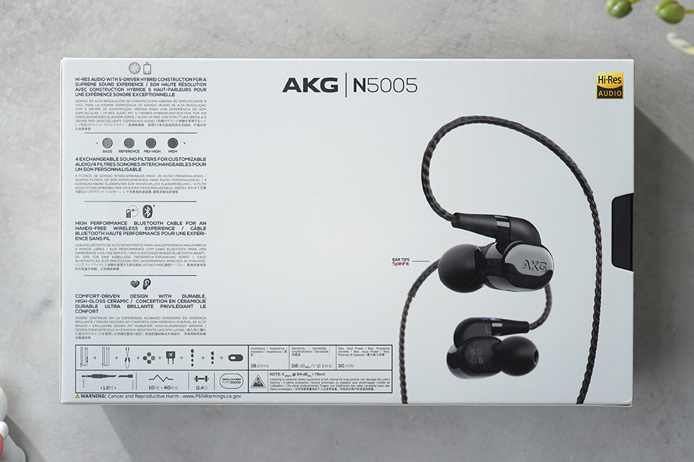AKG N5005 하이엔드 이어폰의 박스는 세련된 스타일로 디자인되었습니다. 그리고 전면에는 하이 레졸루션 오디오(Hi-Res AUDIO)와 블루투스 기능을 탑재했다는 문구가 인쇄되어 있습니다. 참고로 블루투스 기능 때문에 $150 이상에서는 목록통관 대상에 해당하지 않고 관세 혹은 부가세가 청구되어서 가격이 더 비싸졌습니다.
