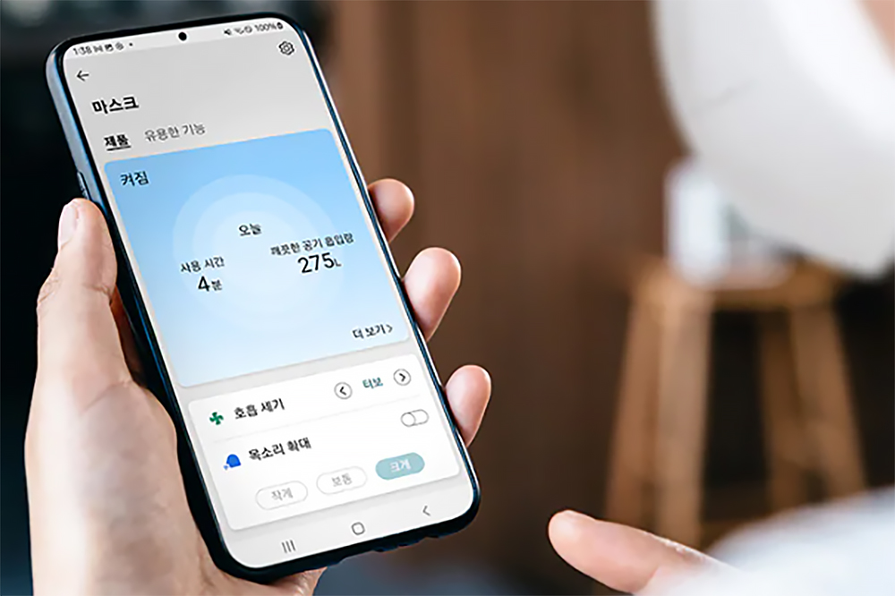 LG 퓨리케어 전자식 마스크에는 둘숨과 날숨을 감지하는 호흡센서와 두 개의 팬이 탑재되어서 편안하게 호흡을 할 수 있도록 도와줍니다. 그 외에도 또렷하게 목소리를 전달할 수 있는 마이크와 스피커도 내장되어 있습니다. 은근히 최첨단입니다.