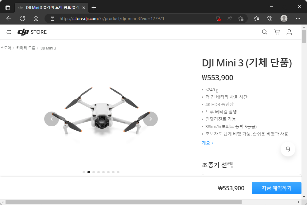 DJI 미니 3 (Mini 3) 초경량 드론의 가격을 살펴보면 기체 단품은 553,900원, DJI RC-N1 포함 제품은 676,900원, DJI RC 포함 제품은 882,900원, 플라이 모어 콤보 플러스는 1,274,000원입니다. 가격은 미니하지는 않은 편입니다.