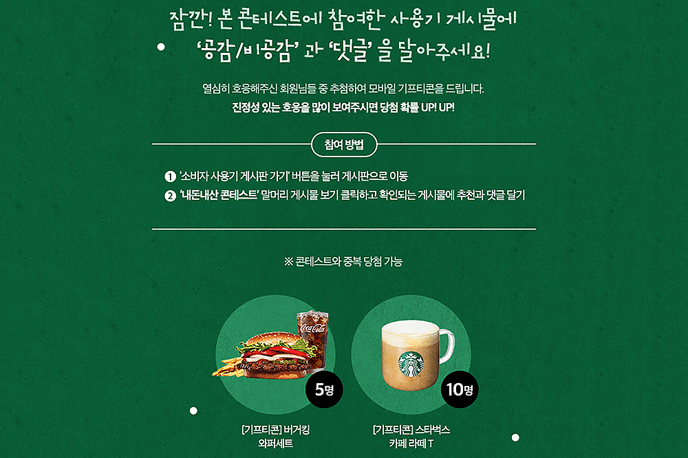 마지막으로 콘테스트에 참여한 사용기 게시물에 공감/비공감 댓글을 다는 회원들에게는 버거킹 와퍼세트와 스타벅스 카페라테 T가 제공되니 한 번씩 참여해 보시길 바랍니다.
