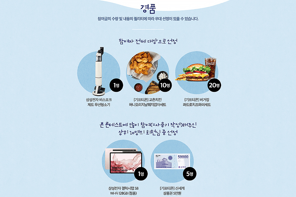 많은 분이 가장 궁금해하는 경품의 경우에는 상당히 푸짐한 편입니다. 우선 참여자 전체 중에서 일부 선정으로 삼성전자 비스포크 제트 무선청소기와 교촌치킨 그리고 버거킹 콰트로치즈와퍼세트가 제공됩니다. 그리고 가장 많은 사용기를 작성한 사람 10명 중에 한 명과 다섯 명에게 삼성전자 갤럭시탭 S8과 신세계 상품권 5만원권이 증정됩니다.