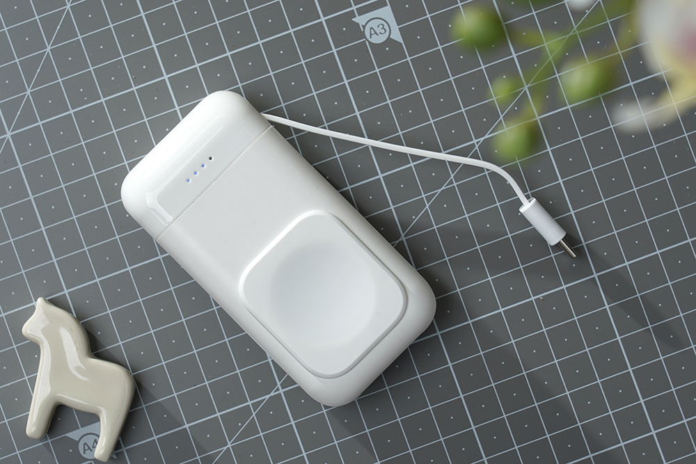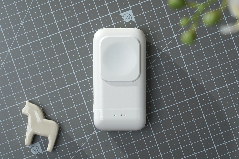 잇버스 워치밥 IBT-WC005 보조배터리는 깔끔한 화이트 색상으로 제작되었습니다. 그리고 위쪽에 갤럭시워치 충전 모듈이 배치되어 있고 마그네틱 고정 기능이 탑재되어 있어서 자석의 힘으로 고정해 줄 수 있습니다.
