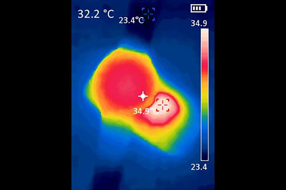 잇버스 워치밥 IBT-WC005 보조배터리에서 갤럭시워치4 44mm를 충전할 때 온도를 확인해 보면 본체의 오른쪽 부분은 약 34.9도 정도가 측정되었습니다. 크게 부담이 되는 편은 아니라고 생각되었습니다.