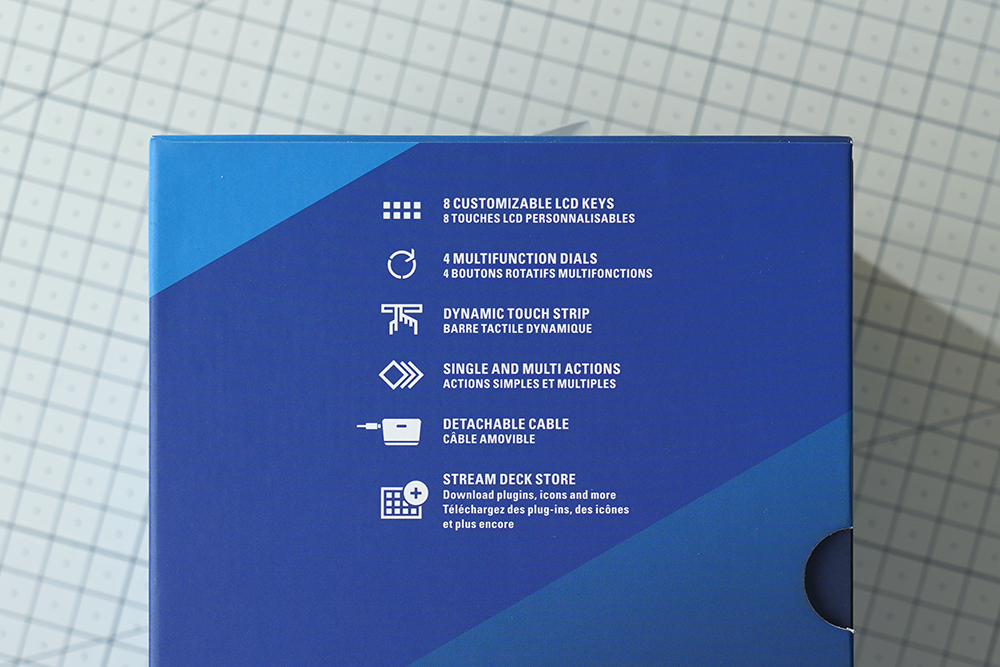 박스의 뒷면에는 엘가토 스트림덱 플러스의 주요 특징이 설명되어 있습니다. 이전 세대의 제품과 가장 큰 차이점은 4개의 다기능 다이얼을 내장하고 있다는 점입니다. 그래서 밝기와 볼륨 등을 간편하게 조절할 수 있습니다.