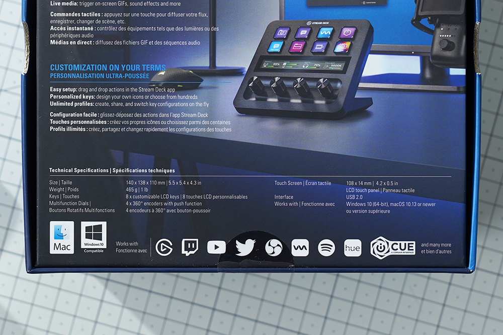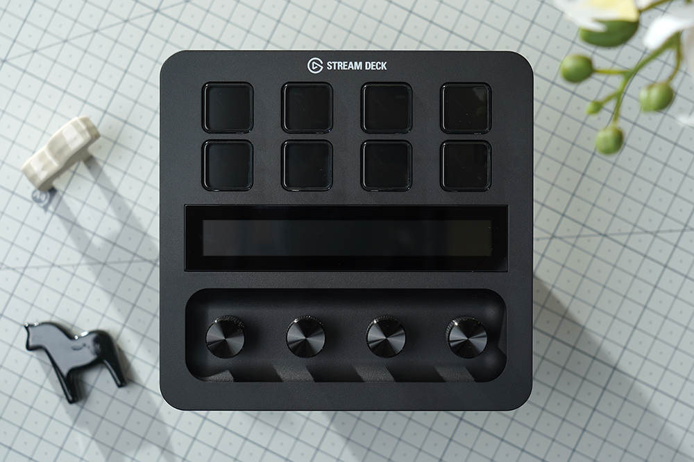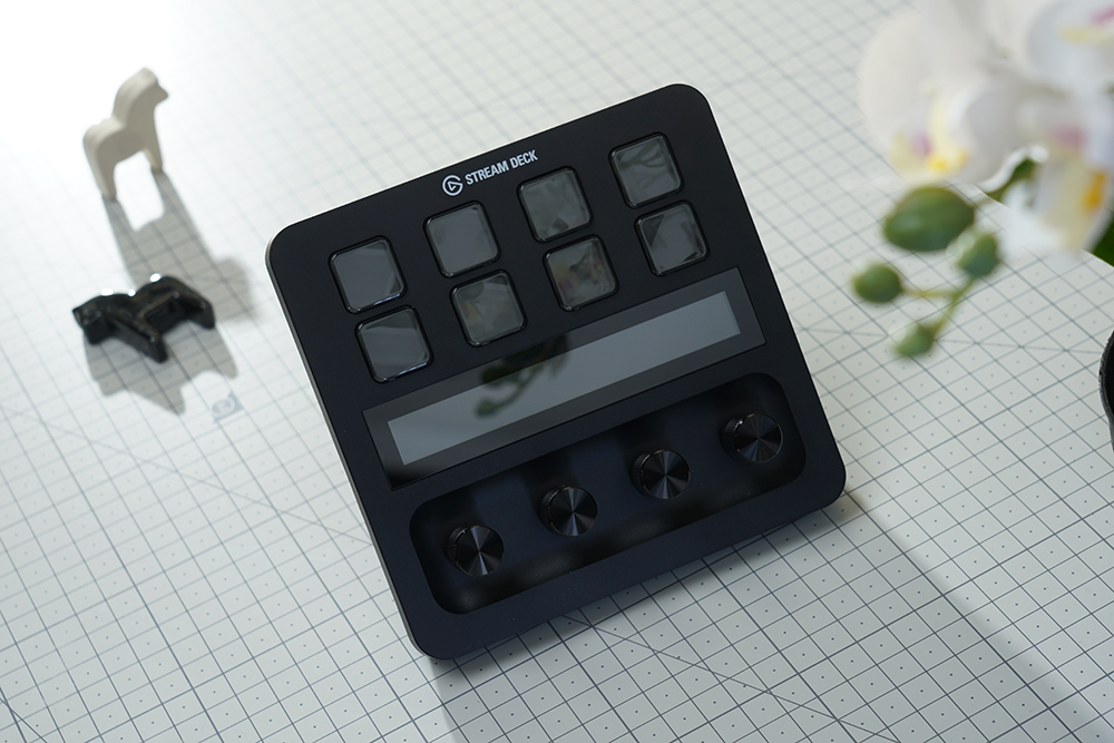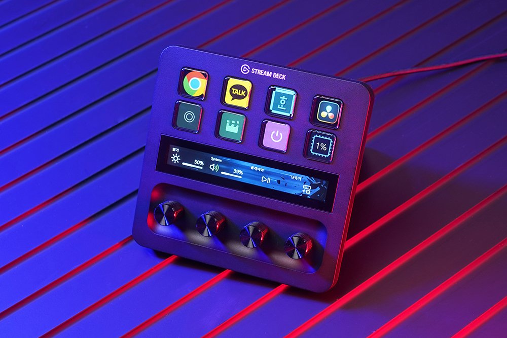 엘가토 스트림덱 플러스의 전면에는 8개의 커스터마이징 가능한 LCD 키와 108 x 14mm의 LCD 터치패널 그리고 푸시 기능이 있는 4개의 360도 인코더가 배치되어 있습니다. 그래서 다양한 방식으로 컴퓨터를 조작할 수 있습니다.