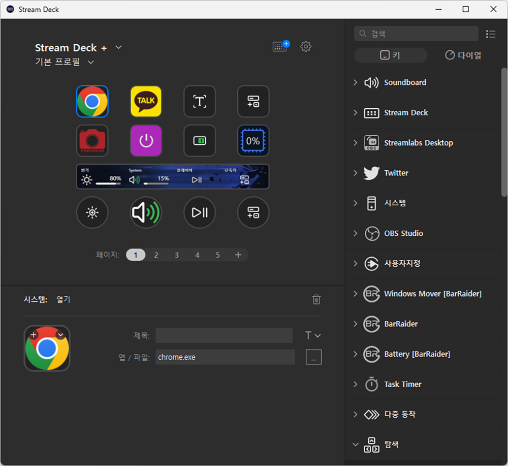 Stream Deck for Windows를 살펴보면 엘가토 스트림덱 플러스의 레이아웃이 왼쪽에 표시되고 오른쪽에 있는 각종 기능들을 드래그 앤드 드롭 방식으로 배치해서 사용할 수 있습니다. 참고로 페이지와 폴더 기능까지 지원해서 활용 범위를 넓힐 수 있습니다.