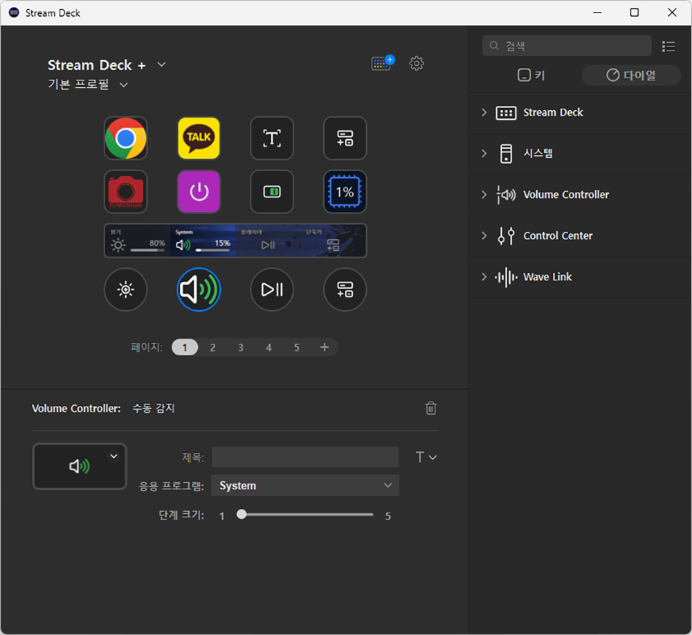 엘가토 스트림덱 플러스는 이전 세대의 제품과는 다르게 푸시 기능이 있는 4개의 360도 인코더를 내장하고 있고 별도의 다이얼 전용 기능들이 준비되어 있는 것을 확인할 수 있습니다. 그리고 해당 기능의 이름과 아이콘도 취향에 따라서 변경할 수 있습니다.