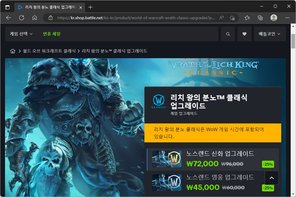 설명이 필요 없는 게임인 와우(WOW)의 경우에는 리치 왕의 분노™ 클래식 업그레이드는 45,000원, 월드 오브 워크래프트®: 따뜻한 겨울 꾸러미는 59.900원에 판매하고 있습니다.