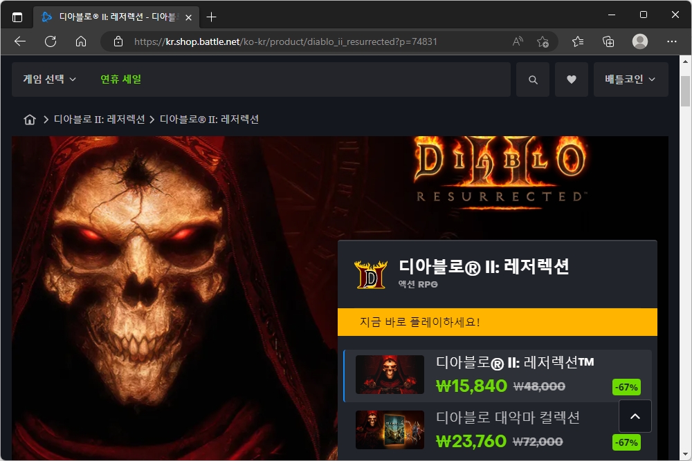 우선 디아블로® II: 레저렉션™의 경우에는 15,840원이고 대악마 컬렉션은 23,760원입니다. 지금까지 중에서는 최저가에 가까우므로 소장하지 않고 있으신 분들은 이번 기회를 이용해 보시길 바랍니다. 참고로 대악마 컬렉션에는 디아블로® III가 포함되어 있습니다.