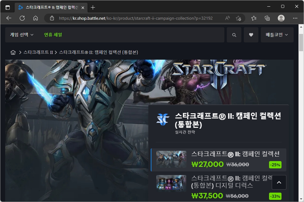 스타크래프트® II: 캠페인 컬렉션 (통합본)은 27,000원에 판매되고 있습니다. 1편에 비해서 큰 인기를 얻지는 못했지만, 캠페인 스토리를 한 번 체험해 보는 것도 큰 의미가 있는 게임이라고 할 수 있습니다.
